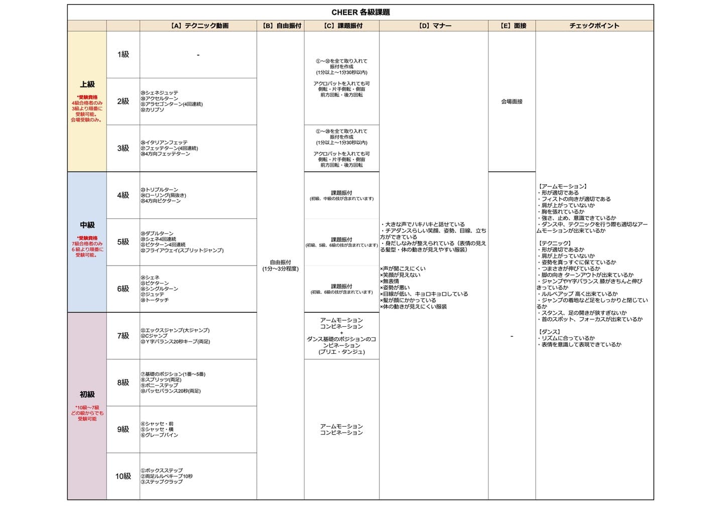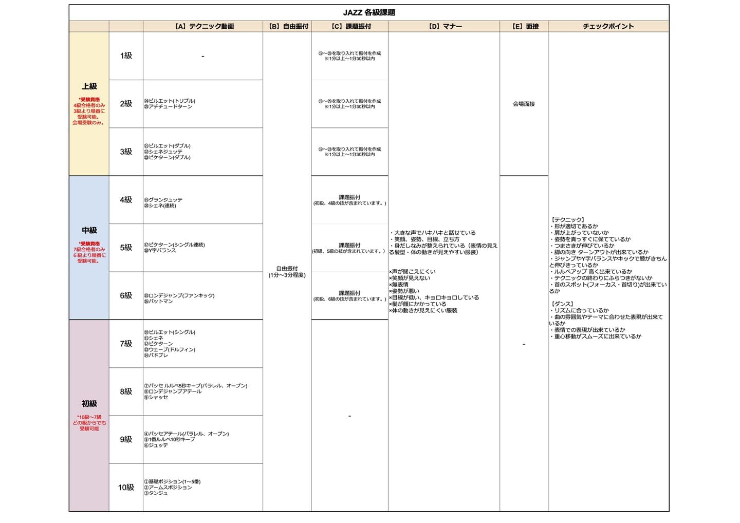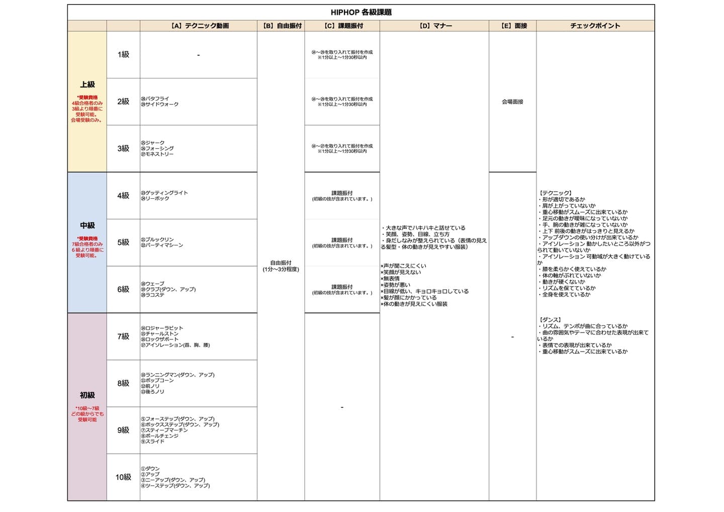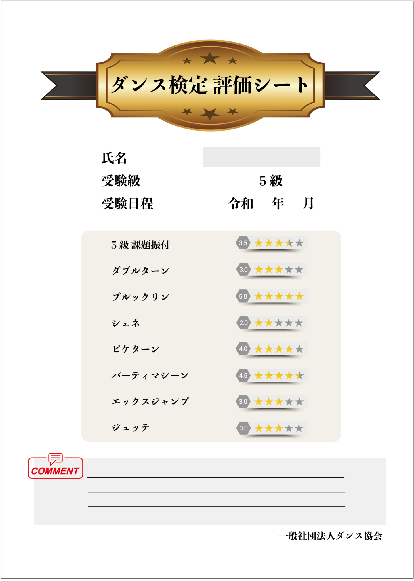 | 採点について | 各級ごとの課題について、テクニックごとに★5つ満点で行います。 全ての項目が★4つ以上で合格となります。 |